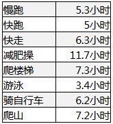 提高基础代谢的最佳方式就是运动,增加体力活动的最佳方式也是运动。那么就是说,要想 100% 的尽快瘦下来,运动是减肥的必选之项。那运动多久才能消耗掉着 3500 大卡(1 斤脂肪)呢?看看下表: