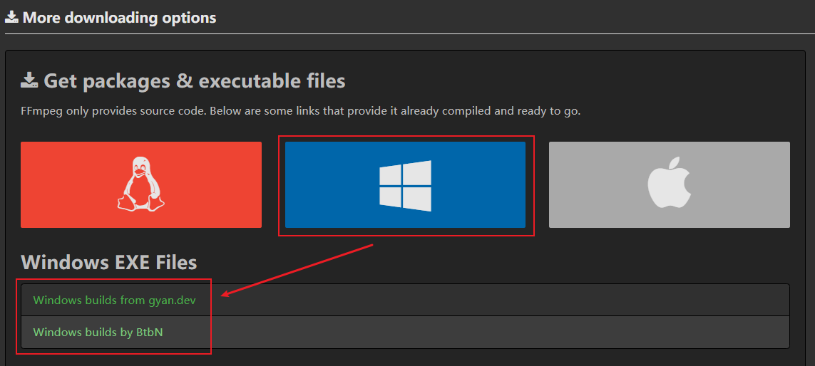 因为在 Python 中使用 ffmpy3 插件做视频合并需要用到 FFmpeg 的可执行文件,因此要先去官网下载安装包:https://ffmpeg.org/download.html