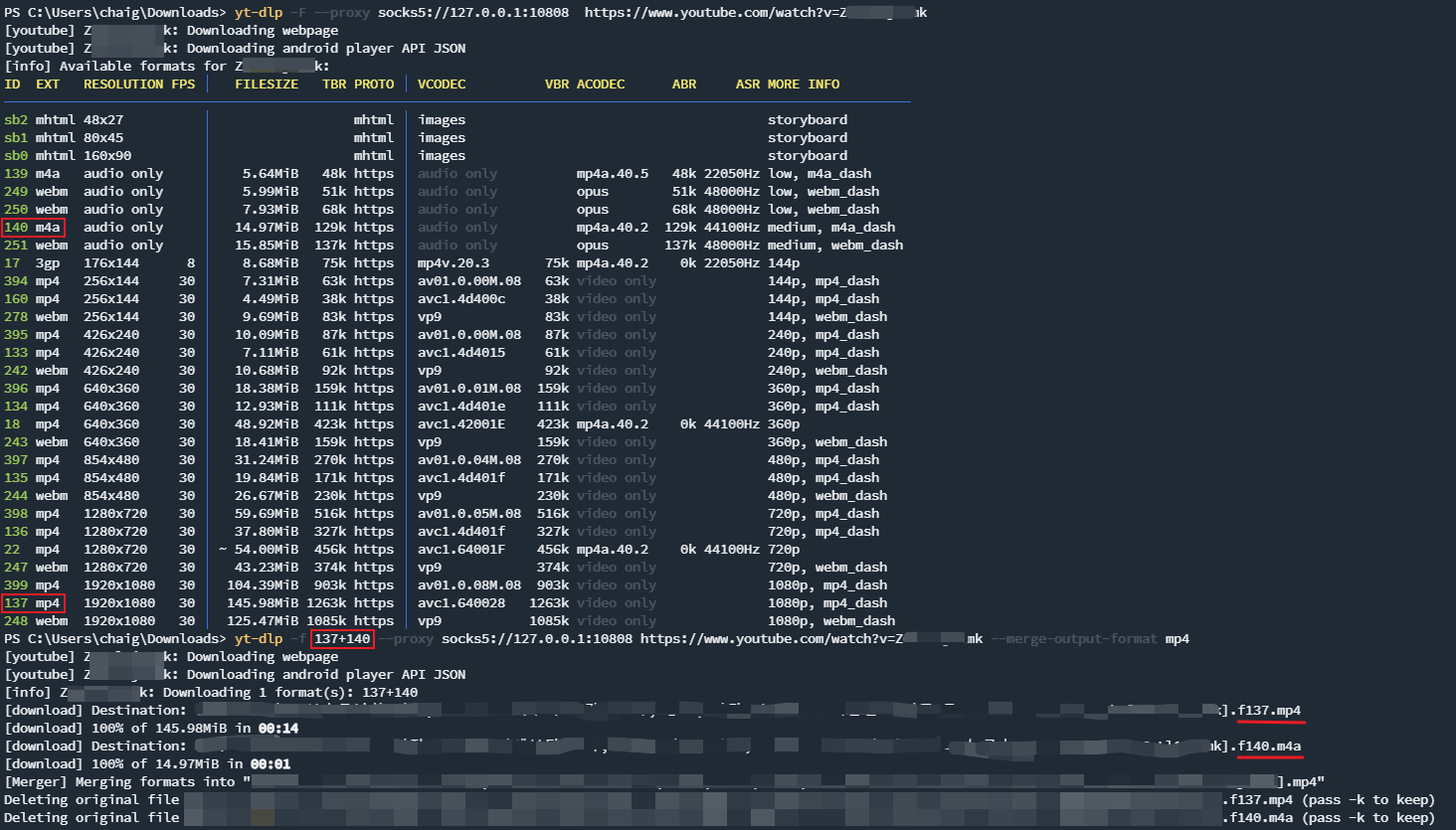 yt-dlp -f 137+140 --proxy socks5://127.0.0.1:1080 https://www.youtube.com/watch?v=ABCDEF --merge-output-format mp4