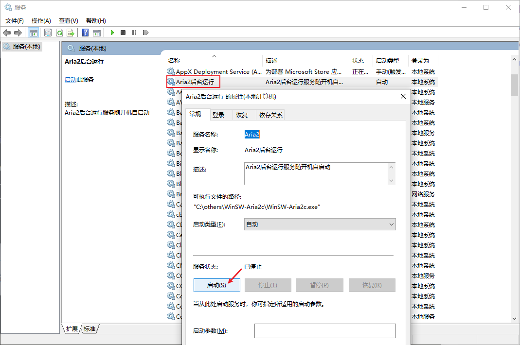 找到 Aria2 服务,双击打开服务详情,然后点击 启动: