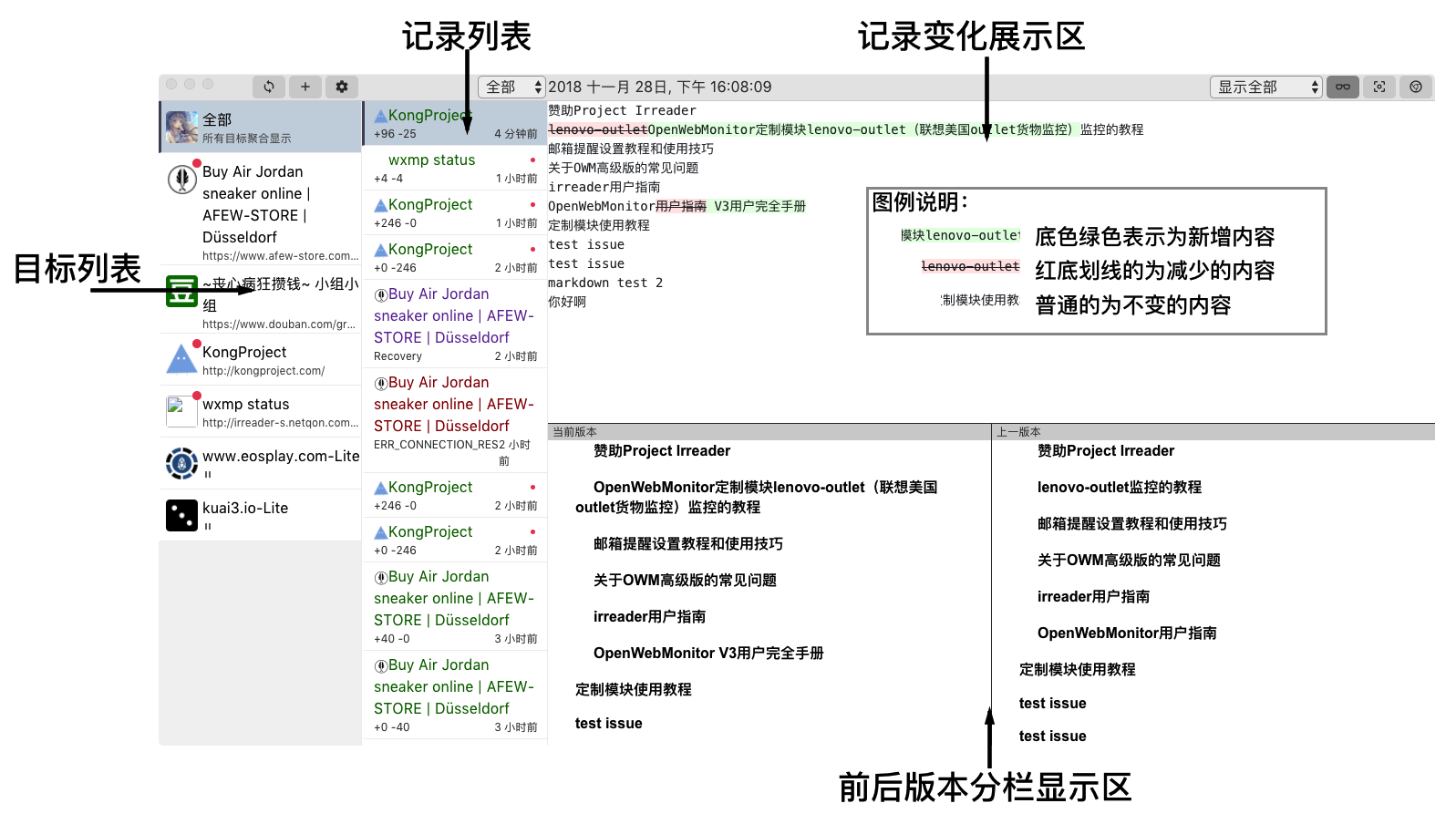 上图就是 OpenWebMonitor 的主界面了,左栏为监控任务列表,中栏是监控内容的历史变化记录,右栏就是详细内容了。
