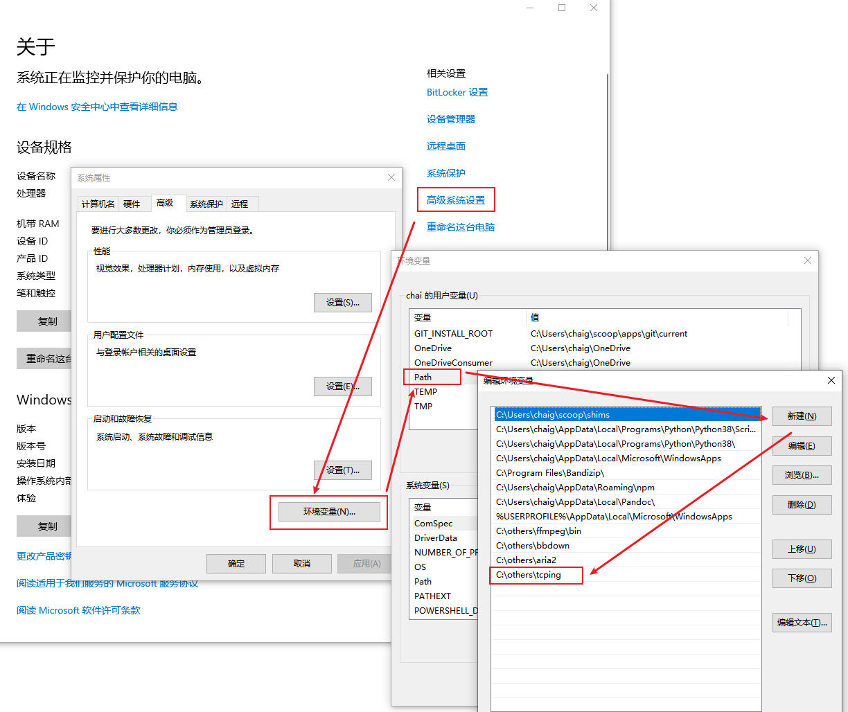 依次打开 系统设置 → 系统 → 关于 → 高级系统设置 → 环境变量 →Path→ 新建 ,然后讲存放tcping.exe 的文件夹路径填入: