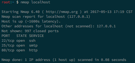 装好后,可以使用 nmap localhost 命令来列出主机中所有的开放端口以及对应使用它们的服务。
