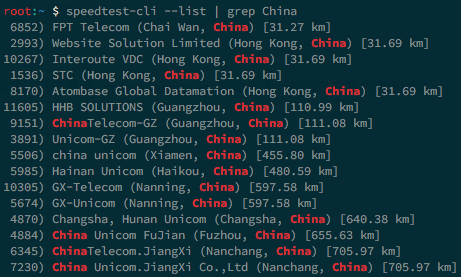 speedtest-cli --list # 根据距离显示 speedtest.net 的测试服务器列表