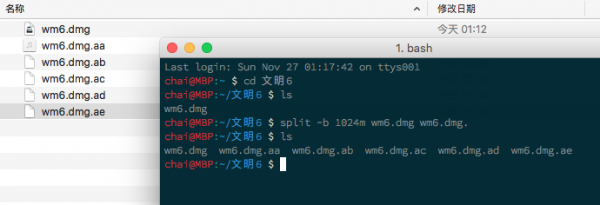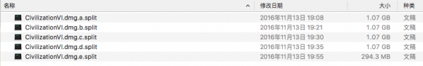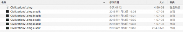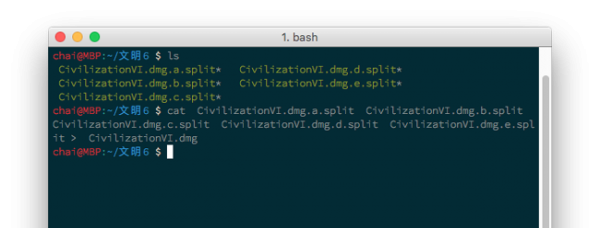 最近弄到了 文明 6 for mac的安装包,拿回来一看发现是若干个 .split 结尾的文件,起初以为是分段压缩包,然后解压缩失败。就去 google 了一下,才明白原来这也是一种分割大型文件的方法,通常是用来上传网盘的时候避开单文件大小限制。