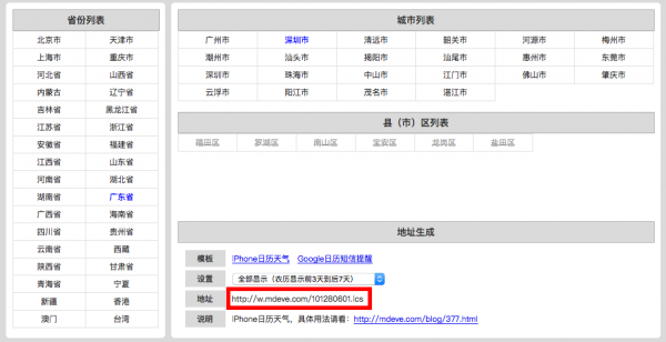 页面交互很简单,生成了某个具体地点天气订阅链接,将其复制,然后粘贴到你的日历工具里就 OK 了~