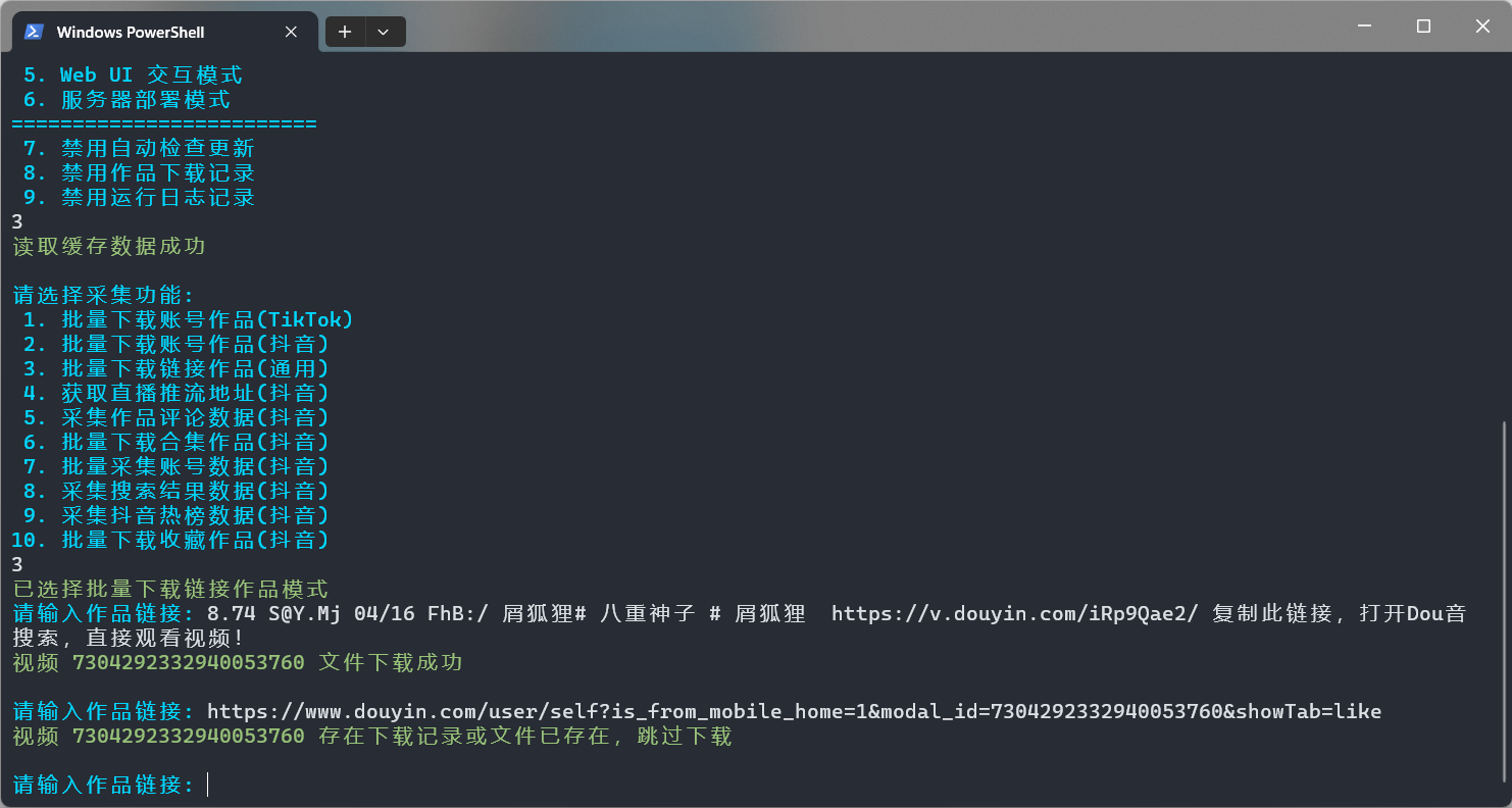 终端命令行模式->批量下载链接作品 - 输入抖音或 TikTok 作品链接即可下载作品文件